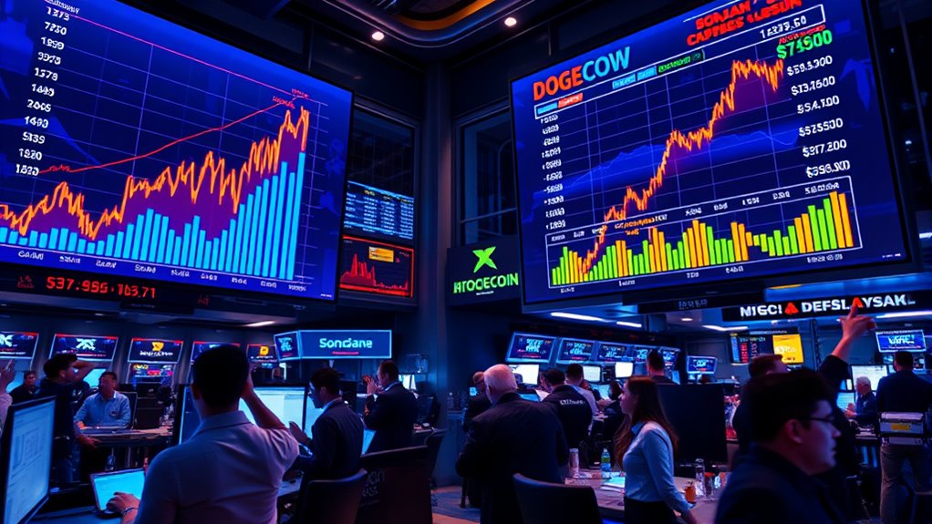 As Bitcoin rallies, Solana and Dogecoin are seeing sharp price increases, driven by strong market momentum and rising investor confidence. Solana, with its fast transaction speeds and growing ecosystem, has jumped past $200, while Dogecoin gains on its meme status and popularity. This surge reflects broader enthusiasm in the crypto space, fueled by Bitcoin’s bullish trend. Keep exploring to discover how these movements might impact future gains and market trends.