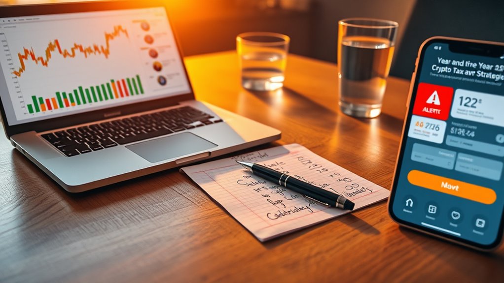 As the year-end nears, you should quickly organize all your crypto transactions, including buys, sells, and transfers, using spreadsheets or software. Stay updated on recent regulatory changes to make certain you’re compliant and aware of new reporting requirements. Consider strategies like harvesting losses to offset gains or timing sales to benefit from long-term rates. For the best results and peace of mind, exploring additional tips can help you finish the year confidently and optimize your tax position.