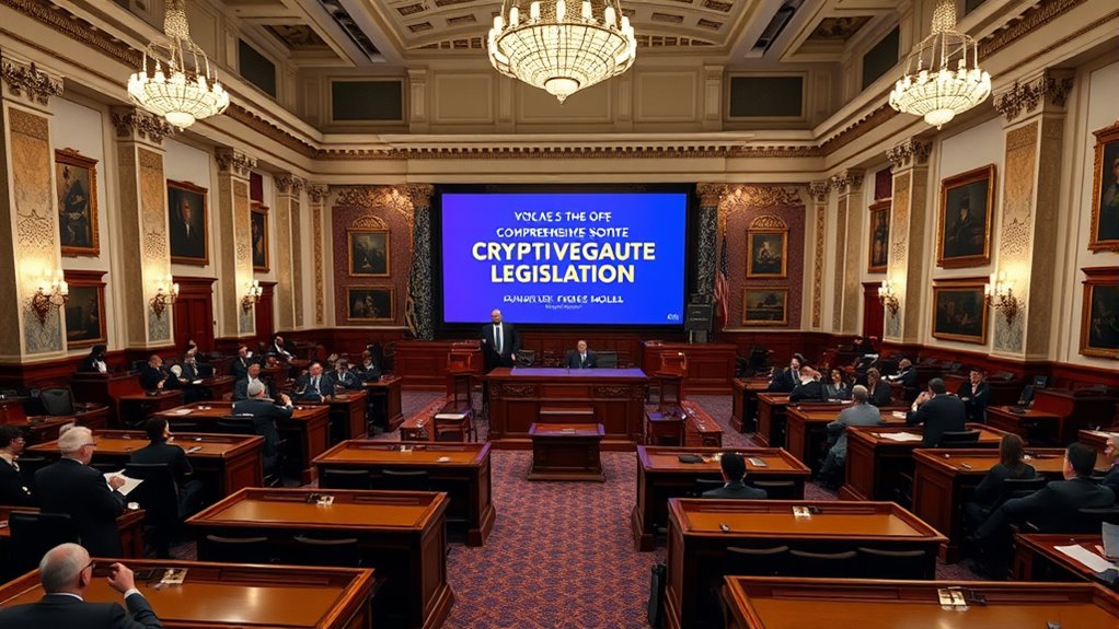 The U.S. Congress is set to vote on all-encompassing crypto legislation, a major step toward clearer rules for digital assets. This legislation aims to define whether tokens are securities or commodities, improve transparency, and strengthen consumer protections. It also clarifies agency roles, reducing legal uncertainties. Industry groups hope it will attract more investors, while critics worry overly strict rules could hinder growth. To understand how this legislation could impact you and the future of crypto, keep exploring the details.