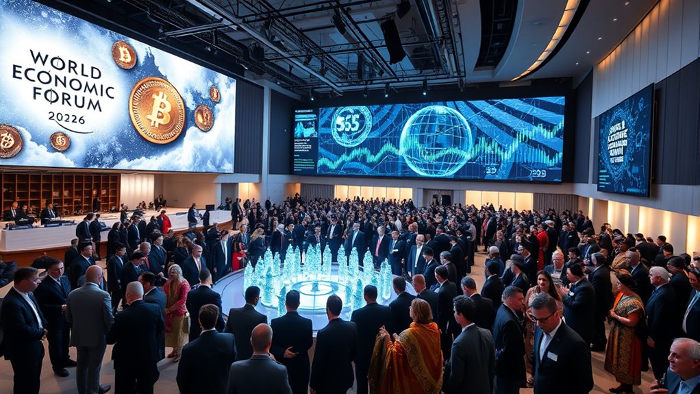At WEF 2026 in Davos, leaders focus heavily on the future of digital currencies and CBDCs, discussing how regulation can balance innovation and stability. You’ll see talks on the integration of digital assets into mainstream finance, with policies aimed at protecting consumers and enhancing financial inclusion. Experts highlight advancements in digital banking and energy tech influencing the landscape. Keep exploring to discover how these developments could shape your financial world in the near future.