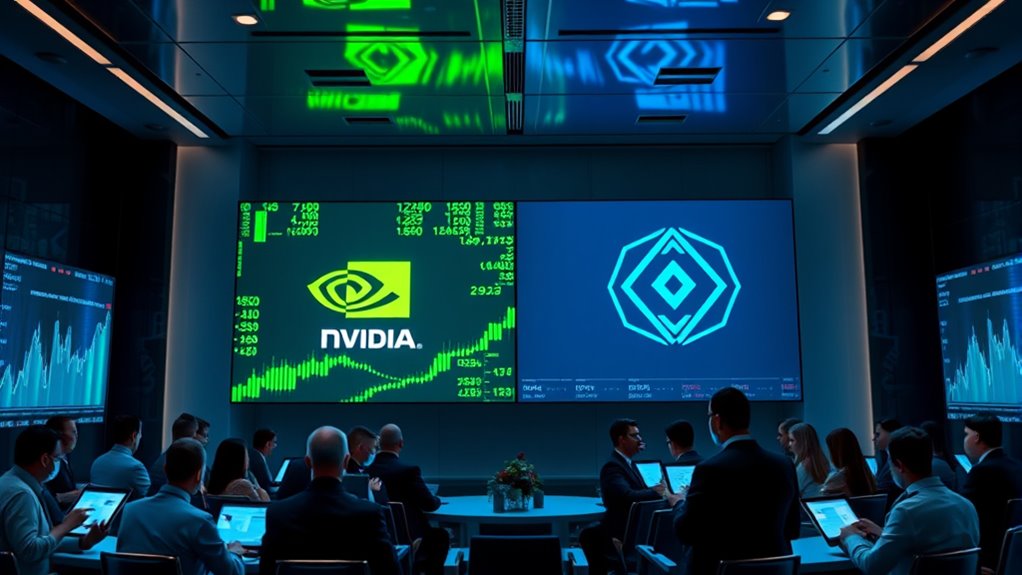 When choosing between Nvidia and Palantir for AI investments, consider their strengths: Nvidia leads in hardware, driving AI processing with its GPUs, while Palantir excels in flexible, subscription-based AI software with strong client loyalty. Nvidia’s hardware dominance faces risks from in-house chip development, but its market value remains high. Meanwhile, Palantir’s software approach offers resilience amid hype. To understand which aligns best with your goals, explore how each company’s strategy stacks up in today’s AI landscape.