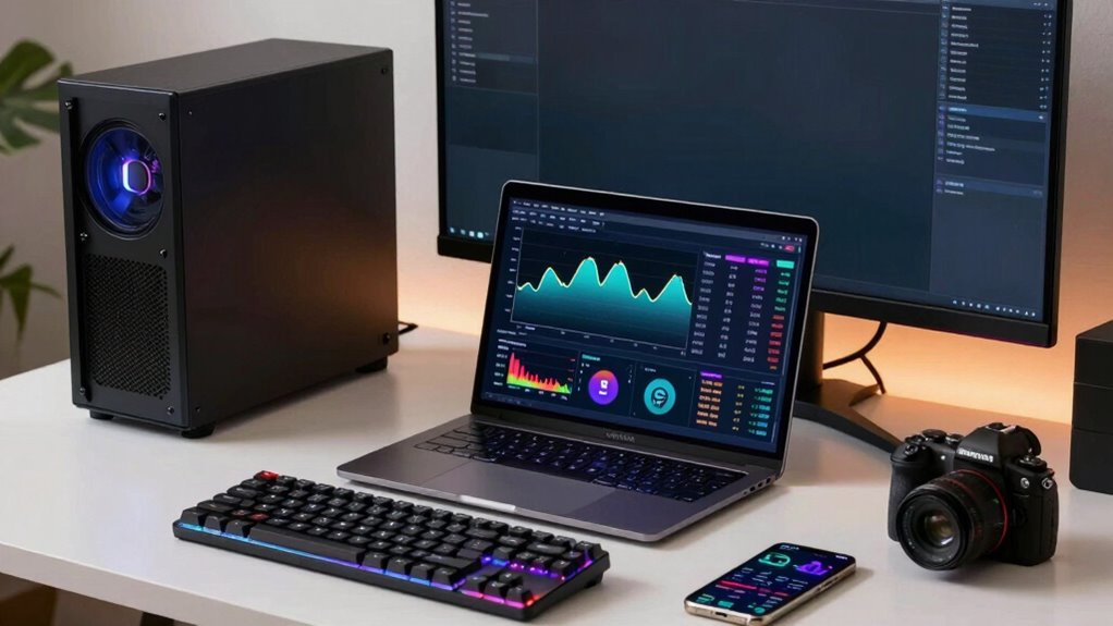 When it comes to crypto research, choosing the right device can considerably impact your workflow and decision-making. Your choice between a laptop and a desktop depends on several factors, primarily how you prioritize portability options and hardware upgradeability. If you often find yourself moving between different locations—whether from a coffee shop to a coworking space—a laptop offers undeniable advantages. Its portability options make it easy to carry your research setup anywhere, so you can stay productive without being tied to a single spot. On the other hand, if your workspace is fixed, and you prefer a more powerful machine that can handle intensive tasks, a desktop might be the better fit.