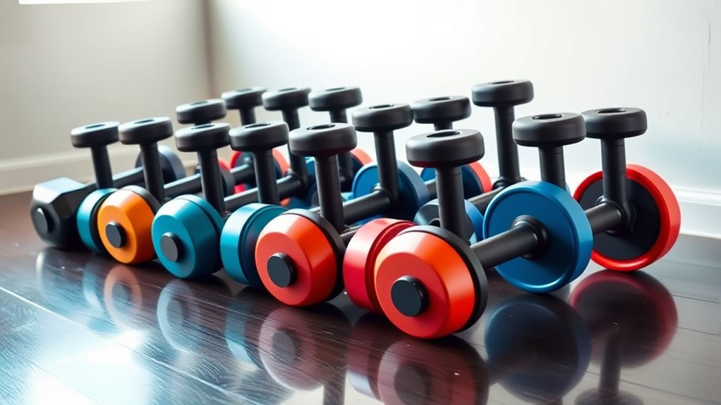 When it comes to adjustable dumbbells, safety features play a vital role in ensuring a secure and accident-free workout. I look for dumbbells with double-locking mechanisms, like auto-locking locks or secure nuts, to prevent plates from slipping during use. Non-slip handles and anti-fall designs are essential to maintain a firm grip and reduce the risk of accidents. I also check that the adjusting mechanisms, whether rotating handles or dial systems, lock weights securely in place with minimal movement, preventing sudden shifts. Durability is key—safety components should resist wear, with reinforced locking nuts or rust-proof pins. Additionally, clear safety instructions and easy-to-use locking systems make quick adjustments safe and straightforward, giving me confidence during every session.