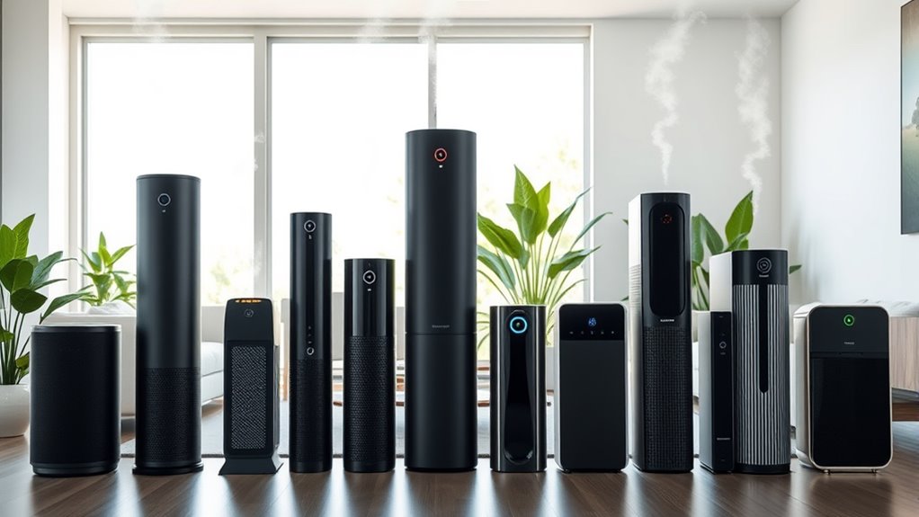 Smart connectivity features have become an essential factor to contemplate when choosing an air purifier, as they considerably enhance user convenience and control. With these features, I can monitor and adjust my purifier remotely via smartphone apps, making it easy to maintain ideal air quality. Many models support voice commands through Alexa or Google Assistant, allowing hands-free operation. Real-time air quality data and filter notifications help me stay on top of maintenance without guesswork. Automated modes, like auto-adjusting fan speeds based on sensor readings, maximize purification without manual input. WiFi-enabled models also offer scheduling, geofencing, and customizable settings, so the purifier adapts to my routine. These features give me peace of mind, ensuring cleaner air effortlessly and conveniently.