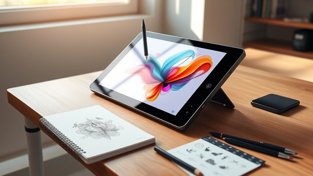 I’ve reviewed the top artist drawing tablets of 2025, including options like the Huion Kamvas Pro 16, XP-Pen Artist16, and Wacom Intuos, all offering high-quality screens with vibrant colors and precise stylus performance. Whether you need a portable device or a professional-grade display, there’s something for every artist. Many models feature advanced sensitivity, compatibility with popular software, and ergonomic designs. Keep exploring to discover which one best fits your creative needs and workflow.