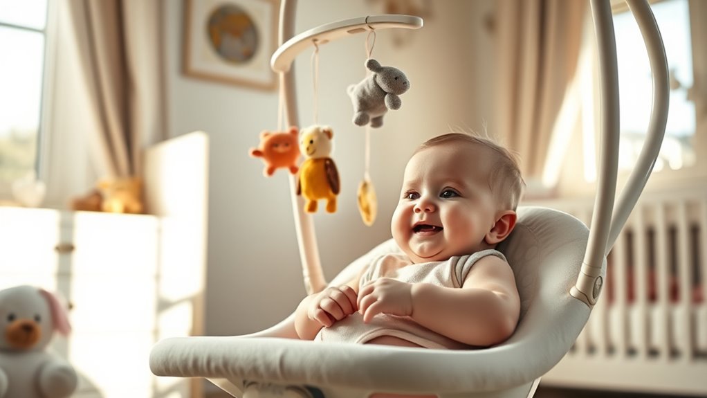 Looking for the best baby swings that soothe and entertain your little one? I’ve found top options like the space-saving Graco Slim Spaces, high-tech 4moms MamaRoo, and versatile Graco DuetConnect LX. Some swings feature Bluetooth connectivity, multiple motions, and adjustable reclines to keep your baby comfortable. Whether you need portability or advanced features, these picks suit various needs. Keep exploring, and you’ll discover the perfect swing that fits your lifestyle and your baby’s comfort.