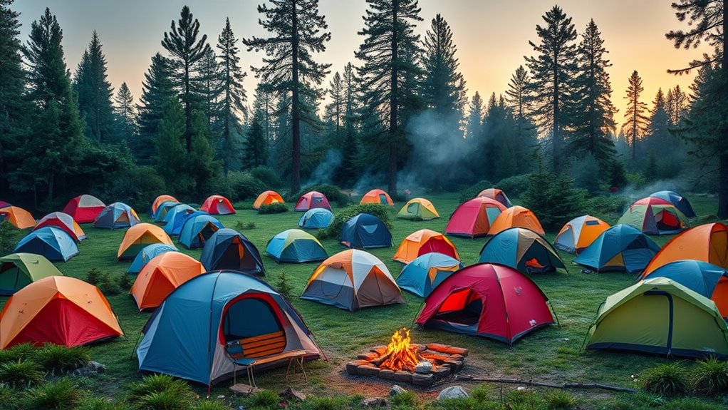 A tent’s setup process and portability can make or break your camping experience. I look for tents that are quick and easy to pitch, ideally in 1-10 minutes, so I can spend more time enjoying my trip. Lightweight models under 10 pounds are perfect for backpacking, while larger tents suit car camping. Features like pre-attached poles, pop-up designs, and color-coded parts really simplify setup, especially if I’m alone or new to camping. Foldability and clear packing instructions help me pack efficiently and keep my gear manageable. I also consider support structure materials—fiberglass or aluminum poles—to guarantee stability against wind and weather. A well-designed tent that’s easy to set up and portable makes the whole adventure smoother and more enjoyable.