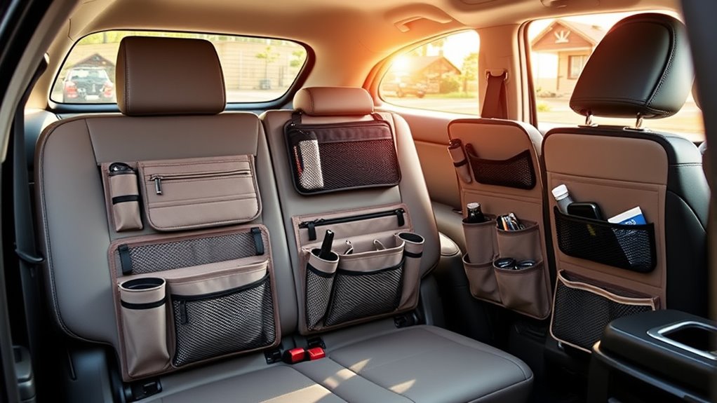 If you’re looking to keep your vehicle tidy, I recommend checking out the 15 best car seat organizers that fit various needs. From durable nylon and waterproof fabrics to multi-pocket designs with tablet holders, these organizers help manage everything from gadgets to snacks and toys. They’re designed for easy installation and compatibility with most vehicles. Continue exploring to find out which options suit your car and lifestyle best.