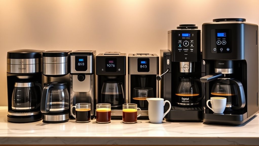 Looking for the 15 best coffee makers of 2025 that consistently brew perfect cups? I’ve found models with advanced brewing tech, versatile functions, sleek designs, and user-friendly features that guarantee great flavor and comfort. From programmable timers to multi-serve options, these options suit every need—whether you want strong brew, single-serve convenience, or stylish durability. Keep exploring to find out which machine matches your daily coffee routine and delivers barista-quality results every time.