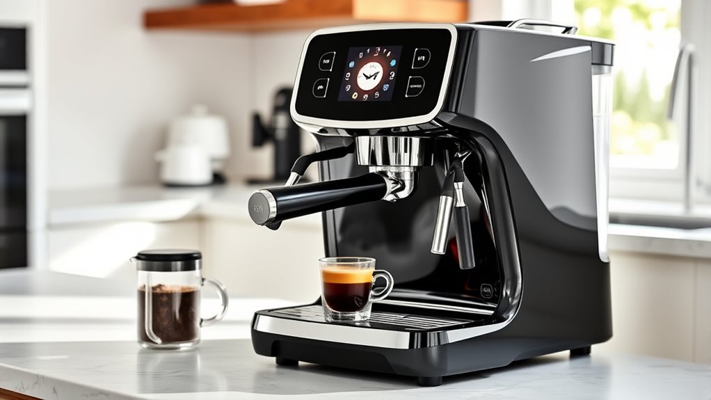 Ever wonder what makes an espresso machine truly beginner-friendly? It’s all about brewing features that give you control without overwhelming you. Look for machines with customizable shot volumes and brewing times so you can tweak each cup to match your taste. Adjustable pressure and temperature controls are also key—they help you fine-tune extraction for richer flavor. Machines with built-in grinders or pre-infusion features can boost your espresso quality right from the start, making it easier to get consistent results. User-friendly interfaces, like digital displays or simple control panels, make operation straightforward. And if you enjoy milk-based drinks, a reliable steam wand or milk frother is essential for crafting lattes and cappuccinos effortlessly. These features combine to make your brewing experience more flexible and enjoyable.