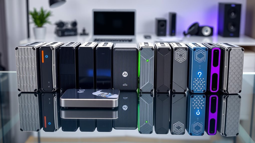 If you’re looking for reliable and fast external drives in 2025, I recommend considering options like the Samsung T7 SSD for speed, the WD My Passport for a balance of capacity and security, or the Seagate Portable HDD for affordability and portability. Rugged features are crucial if you’re on the go or outdoors. Keep in mind security options like encryption, and consider how much storage you need. Continue on, and you’ll discover detailed insights to choose the best fit for your needs.