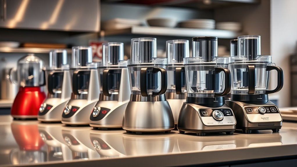Safety features are essential for ensuring I can use a food processor without worry. Interlocking lids and blades that only work when properly assembled help prevent accidents during operation. Overheat protection automatically shuts down the motor if it gets too hot, extending the appliance’s lifespan. Safety locks and locking mechanisms make sure the processor won’t run unless all parts are securely in place, reducing injury risk. Non-slip suction cups or feet stabilize the processor, minimizing movement that could cause spills or accidents. Additionally, sharp blades stored inside the bowl or with safety covers prevent accidental cuts during cleaning or handling. These features give me peace of mind, allowing me to focus on cooking without fearing mishaps or injuries.
