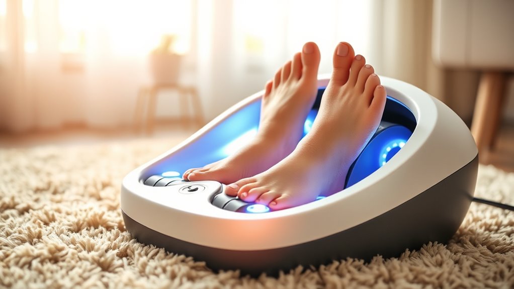 When selecting a foot massager, considering additional therapeutic functions can considerably enhance your experience and relief. Features like heat, vibration, and compression boost blood circulation, relax muscles, and ease pain, offering more thorough comfort. Deep kneading and acupressure target specific pressure points, helping with nerve health and easing conditions like neuropathy or plantar fasciitis. Adjustable intensity levels and multiple massage modes let you customize your session, targeting particular areas of discomfort. Some models incorporate TENS and EMS technology for electrical stimulation, which can manage chronic pain and support muscle recovery. Devices combining various massage techniques often deliver superior relaxation and relief compared to single-function units. Prioritizing these functions ensures you find a foot massager that caters precisely to your needs.