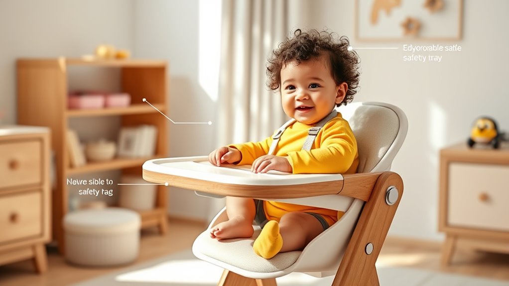When choosing a high chair, I look for safety standards like ASTM F404 and certifications such as JPMA. These guarantee the chair meets rigorous safety tests. I also check for sturdy construction, secure harnesses, and non-toxic materials. It’s important to verify that the chair has a stable base and smooth edges to prevent accidents. Always read reviews and manufacturer info to confirm it’s been tested and certified for safety.