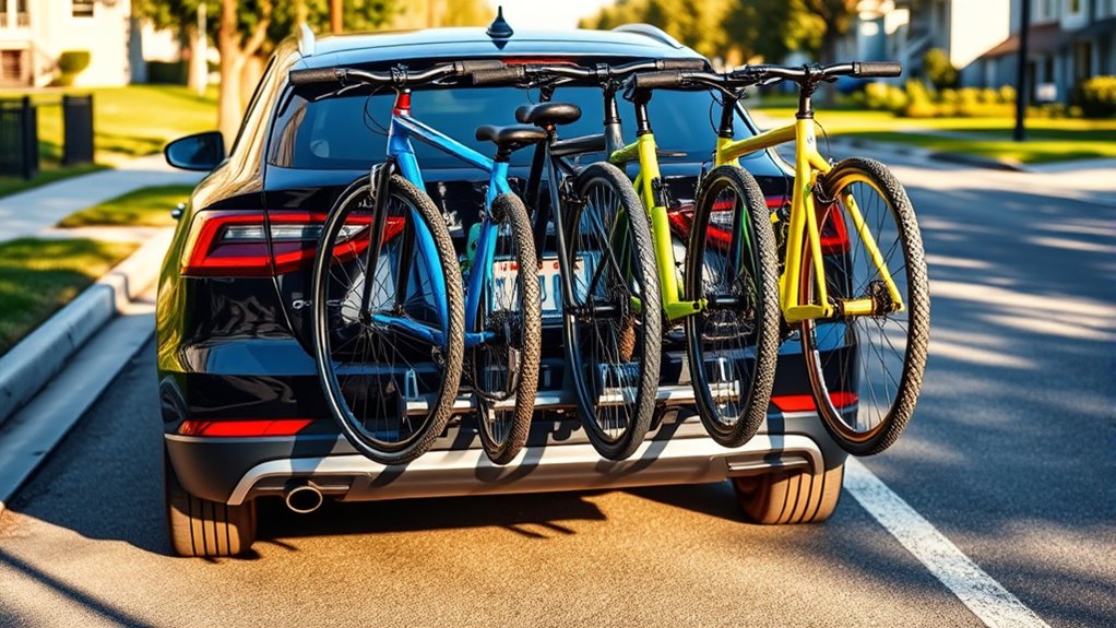 Ever wondered if your hitch bike rack will fit your vehicle perfectly? It’s essential to check compatibility with your vehicle’s hitch receiver size—most are either 1.25 or 2 inches. You’ll also want to make certain the rack’s weight capacity matches your bikes’ weight and your vehicle’s towing limits. Consider your vehicle type—sedans, SUVs, trucks, or minivans—as some racks are designed specifically for certain classes. Also, think about access: does the rack allow for rear door, trunk, or tailgate access without hassle? Ultimately, verify that the mounting system suits your hitch style, whether it’s a class I, II, III, or IV receiver. Proper fit ensures safety, ease of use, and compatibility with your vehicle’s features.