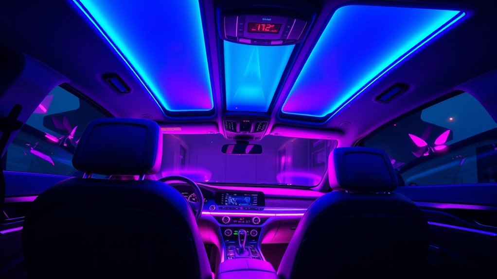 Personalizing your car’s interior lighting involves more than just selecting a color; it’s about finding the right features that match your style and preferences. Many LED systems offer adjustable colors, brightness, and dynamic modes like flashing, fading, or jumping effects, so you can craft the perfect vibe. App control is a game-changer, letting you pick from millions of colors and create custom patterns or effects easily. Some lights even have scene modes, such as music sync, which reacts to your playlist, adding a lively touch. Saving and recalling preset configurations makes switching between setups effortless. Compatibility with remote controls, touch panels, and voice commands further enhances customization, allowing you to tailor your interior lighting to suit different moods or occasions effortlessly.