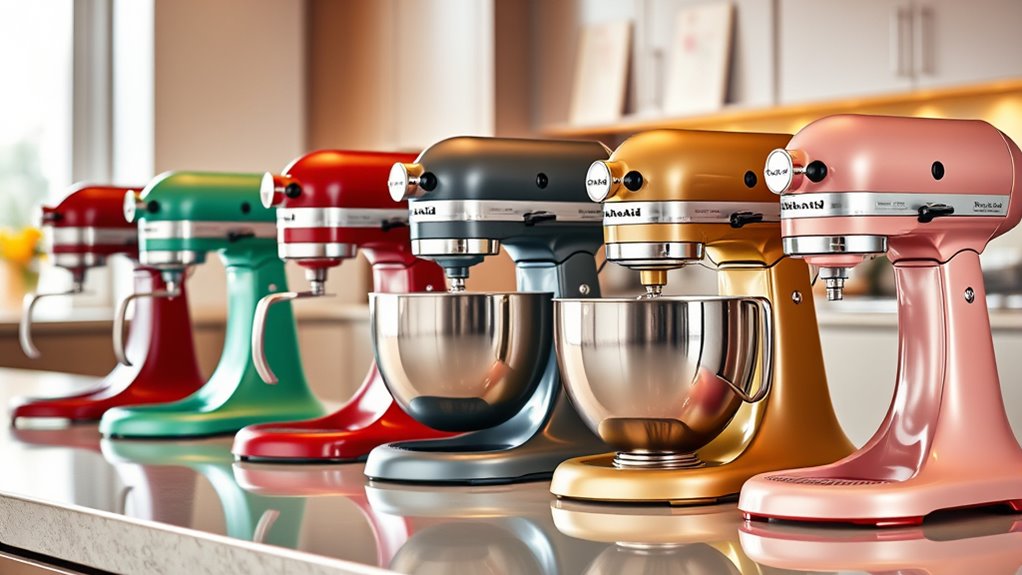 If you’re choosing the perfect KitchenAid stand mixer color in 2025, I recommend considering your style and kitchen decor. Classic options like white and silver offer timeless elegance, while bold shades like Empire Red and Matcha add personality and vibrancy. Neutral tones boost resale value and blend easily with any setup, whereas trendy colors make a statement. Stay tuned to discover which shade best complements your space and personality.