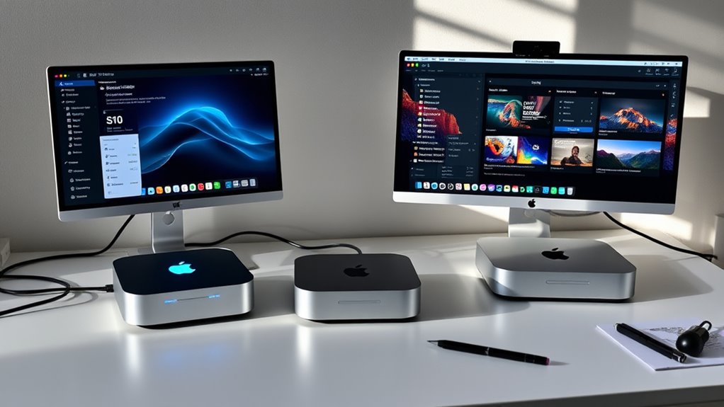 Selecting the right display setup for your Mac Mini is crucial for creators, as compatibility depends on matching the device’s video output ports with your monitor’s connection type—be it Thunderbolt, HDMI, or DisplayPort. Make certain your Mac Mini’s ports support your monitor’s input to avoid connection issues. Check that the Mac can handle your display’s resolution and refresh rate, whether it’s 4K, 5K, 6K, or 8K, for smooth visuals. If you plan to use multiple screens, verify the Mac Mini’s multi-display support—some models support up to three monitors simultaneously. Also, ensure the ports and video engines are compatible with features like HDR. Newer models with Thunderbolt 4 or DisplayPort 2.1 offer broader compatibility with high-res, high-refresh-rate displays, making them ideal for demanding creative workflows.
