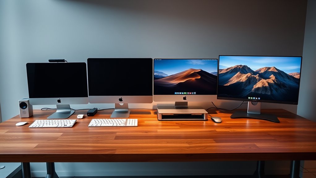 To guarantee your Mac Studio can handle your display needs, it’s vital to verify that the configuration supports your monitor’s resolution and refresh rate, whether that’s 6K at 60Hz or 8K at 60Hz, through Thunderbolt 4 or HDMI. Make sure the device has enough Thunderbolt 4 ports or HDMI outputs to connect multiple displays simultaneously. Check that the graphics capabilities, including hardware-accelerated ray tracing and media engines, are robust enough for high-resolution or HDR content. Native DisplayPort 1.4 or 2.1 support is essential for peak performance with high-end or multiple external displays. Additionally, consider the compatibility of external adapters or cables needed for non-standard or legacy monitors to guarantee seamless display integration.