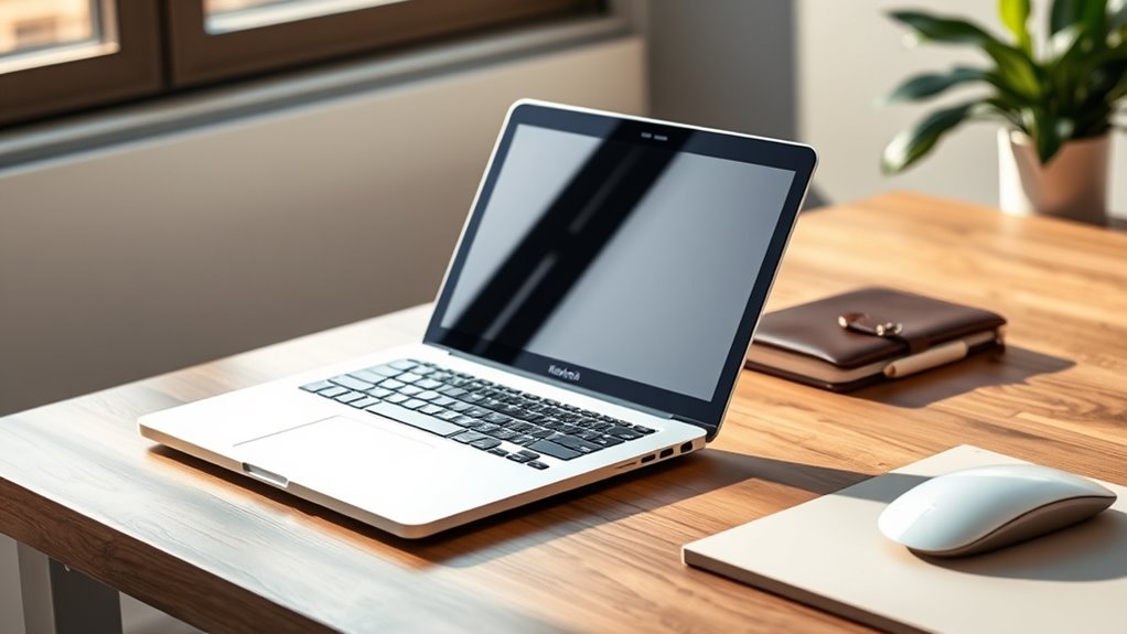 Security features are a critical consideration for business professionals choosing a MacBook Air, as safeguarding sensitive data is paramount. Models with Touch ID offer biometric authentication, making it easy and secure to access your device and authorize transactions. The integrated Secure Enclave in the M4 chip encrypts stored data and guarantees a secure boot process, protecting against tampering. macOS also provides strong privacy protections, including app sandboxing and permissions management, to keep your data safe. Regular automatic updates patch vulnerabilities and strengthen security. Additionally, hardware-based security features like the T2 chip in older models or the secure enclave in newer chips add extra layers of protection. These features collectively guarantee your sensitive information remains secure in every aspect of your business operations.