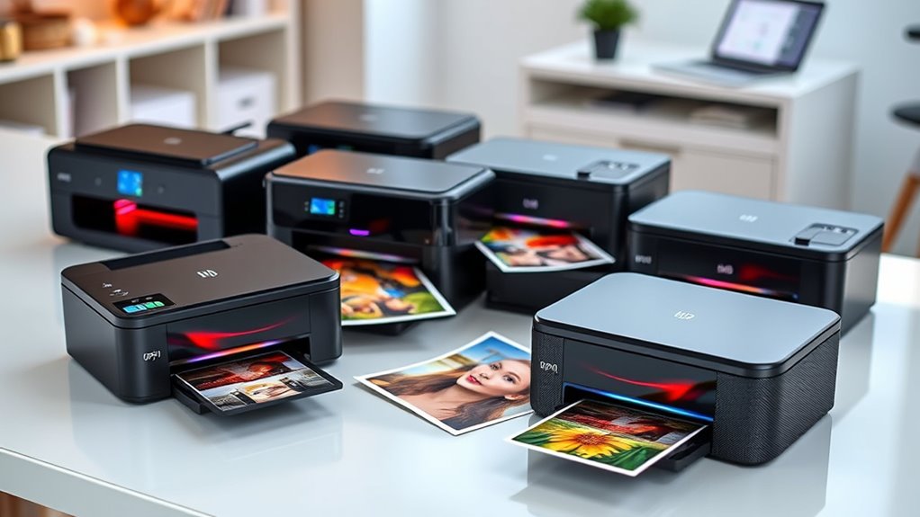 Looking for the best photo printers of 2025 that deliver stunning images and easy operation? I recommend models like the Epson EcoTank ET-8550, Canon G620, and Epson XP-7100 for their vibrant, professional-quality prints and versatile media options. Portable options like the Liene M100 and KODAK Dock Plus are great for on-the-go printing. If you’re curious about the top features and which printer fits your needs best, there’s more to explore ahead.