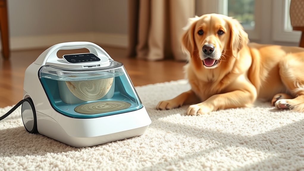 Selecting a portable carpet cleaner for pets becomes much easier when it features intuitive controls and simple operation steps. I look for models with user-friendly interfaces that don’t require a manual for every function. A lightweight design and ergonomic handle make maneuvering effortless and help reduce fatigue during cleaning. Clear indicator lights or displays are invaluable—they quickly show tank levels and operational status, preventing surprises mid-clean. Features like self-cleaning hoses and detachable tanks save time and make maintenance straightforward. Compact size and organized storage for tools and accessories make the device easy to store and access when needed. Overall, a cleaner that’s easy to use means less frustration and more effective cleanup, helping me keep my home fresh with minimal hassle.