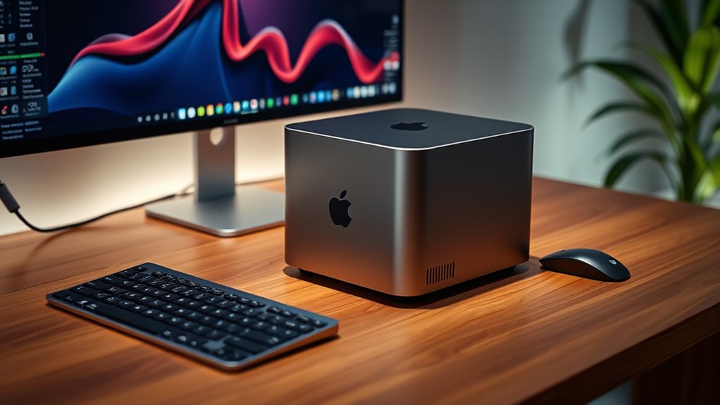 Evaluating the performance specifications of a renewed Mac Studio is essential to guarantee it meets your workload demands. First, consider the CPU and GPU configurations—options like the M4 Max with a 32-core GPU or the M4 Pro with a 16-core GPU—matching your processing needs. The amount of unified memory, such as 36GB or 48GB, is pivotal for smooth multitasking and working with large files. Check the storage capacity, typically from 512GB to 8TB SSD, making sure there’s enough space for your data and apps. Review hardware-accelerated media engines supporting formats like ProRes, HEVC, and AV1, which streamline media processing. Finally, assess thermal management and power efficiency to maintain performance during intensive tasks. These factors make certain that your renewed Mac Studio aligns with your professional requirements.