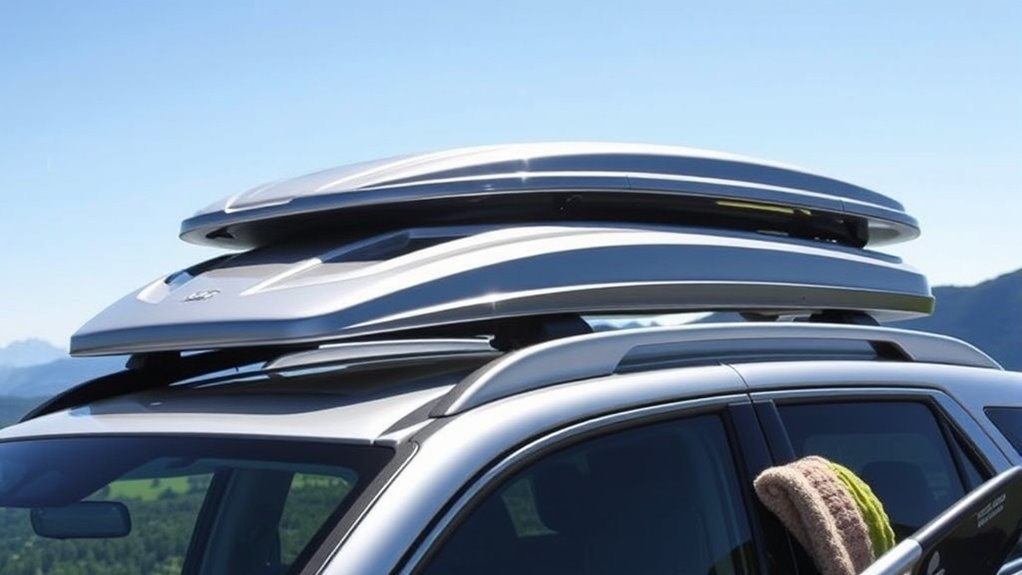 Since wind resistance affects both fuel efficiency and driving comfort, choosing an aerodynamically designed roof cargo box is a smart move. These boxes feature streamlined shapes that cut down on drag, helping you save fuel on long trips. The design of the lid and overall profile also impacts noise levels—smoother surfaces produce less wind noise at highway speeds. Properly shaped cargo boxes reduce turbulence around the vehicle, making for a quieter, more comfortable ride. Taller or boxier designs tend to create more air disturbance and noise, so choosing a sleek, aerodynamic shape is beneficial. Additionally, aerodynamic features help minimize wind-induced vibrations and rattling, ensuring your journey is not only efficient but also peaceful and less distracting.