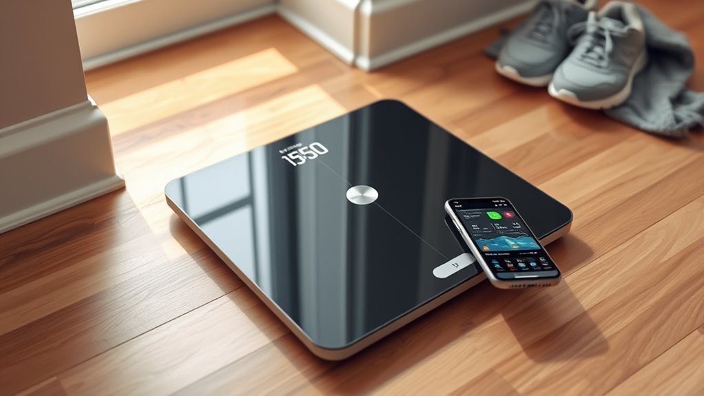 Ever wonder if your smart scale’s app can keep up with your fitness tracking needs? It’s vital to verify if the app is compatible with your smartphone’s OS, like iOS 12.0+ or Android 6.0+. Make sure it syncs seamlessly with popular platforms such as Apple Health, Google Fit, Fitbit, or MyFitnessPal, so all your data stays integrated. Look for features like goal setting, trend analysis, long-term storage, and progress visualization to stay motivated. If you share your device with family, confirm the app supports multiple user profiles for personalized tracking. Ultimately, consider whether the app requires an active internet connection or supports offline data storage—this can be a game-changer during workouts or travel. These factors ensure your scale fits smoothly into your fitness routine.