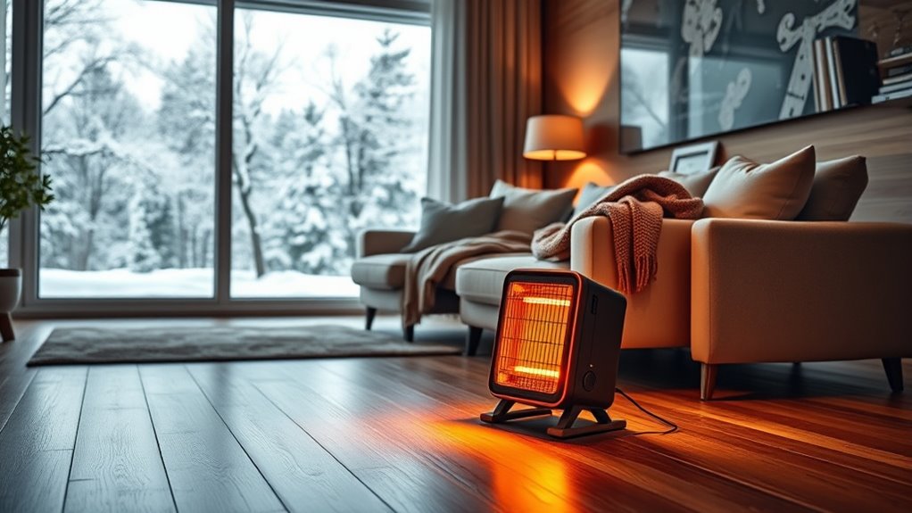 Selecting the right space heater involves more than just size and wattage; safety features play an essential role in ensuring peace of mind. Features like tip-over protection and overheat shutoff are vital to prevent accidents and fires during use. Flame-retardant materials, such as V0-rated plastics, add an extra layer of safety by making the heater more resistant to ignition. Automatic safety shutoffs activated by sensors ensure the heater turns off if it overheats or tips over, maintaining safe conditions. Certifications like ETL or UL validate that the heater meets strict safety standards, giving me confidence in its reliability. Additional features like child locks and cool-touch exteriors help prevent injuries and unauthorized use, making safety a top priority in my selection process.