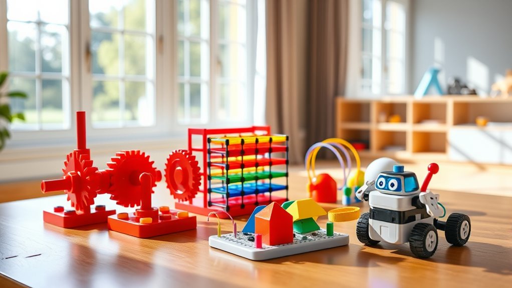 How do you choose the right STEM toys that truly support your toddler’s development? First, look for toys that enhance fine motor skills through activities like stacking, fitting, or twisting. These help improve coordination and hand strength. Next, consider toys that introduce early engineering concepts, such as building or assembling, fostering curiosity about how things work. It’s also important to select toys that challenge problem-solving and critical thinking with open-ended or guided tasks, which promote cognitive growth. Additionally, opt for toys that develop spatial reasoning by involving shapes, patterns, or visual organization. Above all, choose age-appropriate options to guarantee your child isn’t overwhelmed while still supporting their learning journey. The right focus helps build foundational skills with confidence and joy.