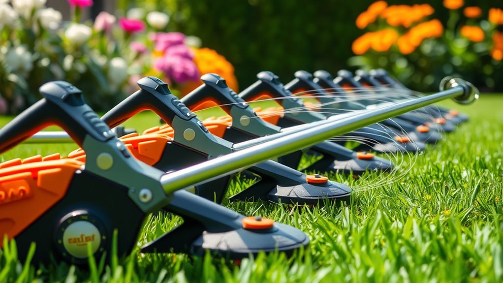 The best string trimmers include essential safety features like automatic line feeders to prevent jams, protective guards to shield you from debris, and safety switches or triggers that require deliberate engagement. Some also have vibration reduction systems to lessen fatigue and accidental slips. I always look for models with these safety features because they keep me protected while making yard work safer and more comfortable.
