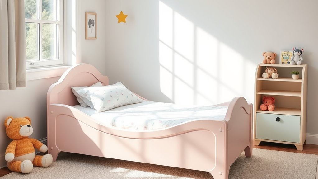 Did you know that falls are the leading cause of injuries in toddlers? I always look for beds with low sides or guardrails to prevent falls. Safety features like sturdy construction, rounded edges, and non-toxic finishes are also essential. I avoid beds with gaps or spaces that tiny limbs could get caught in. Ensuring these safety features helps me keep my little one secure and comfortable at bedtime.