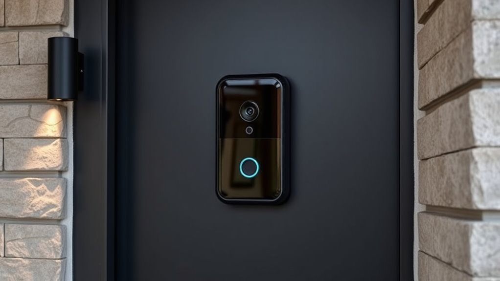 A video doorbell’s durability against the elements is just as important as its smart features. To guarantee it withstands rain, snow, and dust, look for models with an IP65 or higher weatherproof rating. Choose doorbells made from corrosion-resistant metals or high-grade plastics that resist UV damage over time. It’s also essential to verify the operating temperature range, so your device performs reliably in extreme cold or heat. Sealed connectors and weatherproof enclosures prevent water ingress and electrical failures, extending the lifespan of your doorbell. Additional features like UV-resistant coatings and anti-fog lenses help maintain clarity and functionality in harsh conditions. Prioritizing weather resistance guarantees your doorbell stays reliable, no matter the weather outside.